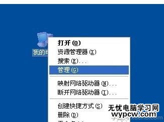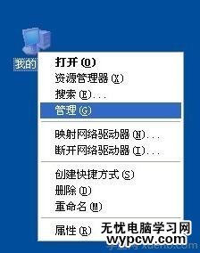 右擊桌面上“我的電腦”圖標,彈出的快捷菜單單擊“管理”命令