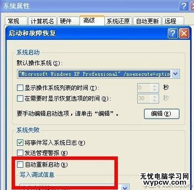 在“啟動(dòng)和故障恢復(fù)“窗口中,我們找到”自動(dòng)重新啟動(dòng)“選項(xiàng),并將它前面的√取消。