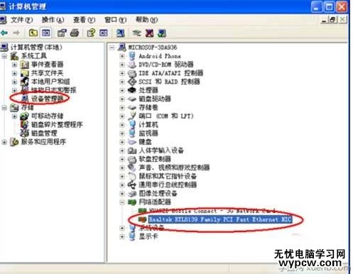 4、在“計(jì)算機(jī)管理”窗口中點(diǎn)擊“設(shè)備管理器”,然后找到存在不兼容硬件設(shè)備或驅(qū)動(dòng)未正確安裝的設(shè)備。對(duì)于驅(qū)動(dòng)未正確安裝的設(shè)備,建議重啟安裝其對(duì)應(yīng)官方驅(qū)動(dòng)。對(duì)于不兼容的硬件設(shè)備,就在對(duì)應(yīng)設(shè)備上右擊,選擇“禁用”命令將其禁用。