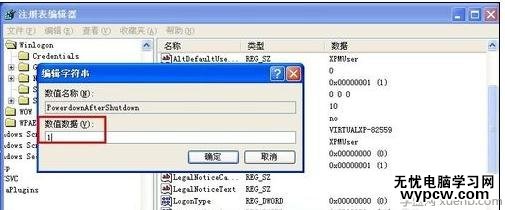 在右邊窗口找到并雙擊打開數值名稱“PowerdownAfterShutdown”的字符串鍵值,將數值數據修改為“1”,設置完成戶單擊“確定”按鈕即可生效