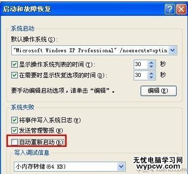 在系統失敗選項下將“自動重新啟動”的復選框去掉,然后一路單擊“確定”按鈕使設置生效。