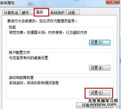 在打開的“系統屬性”窗口中,切換至“高級”選擇卡,然后點擊“系統和故障恢復 設置”按鈕。