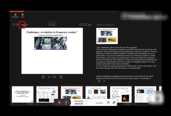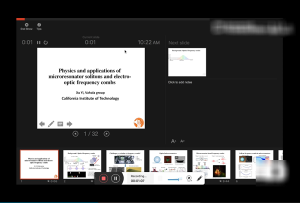 第四步,此時,內容就開始錄制了,錄制的內容包括你的PPT的播放的內容,以及你的講解內容。