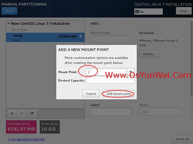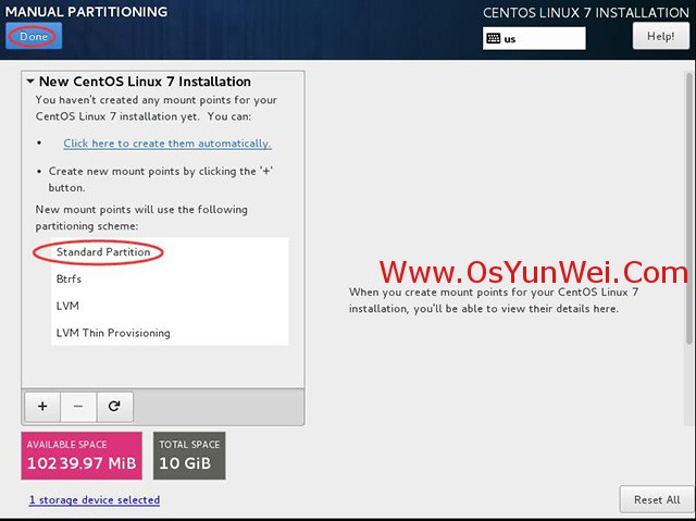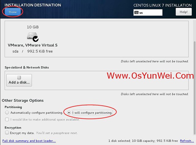 選擇-系統SYSTEM-安裝位置INSTALLTION DESTINATION,進入磁盤分區界面