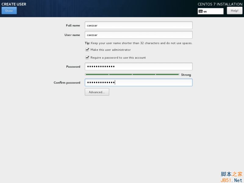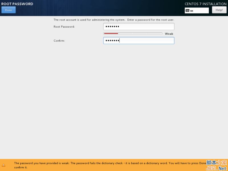 root 賬戶是每個(gè) Linux 系統(tǒng)的最高管理賬戶密碼,它擁有所有的權(quán)限。設(shè)置完成后點(diǎn)擊完成按回到用戶設(shè)置界面。