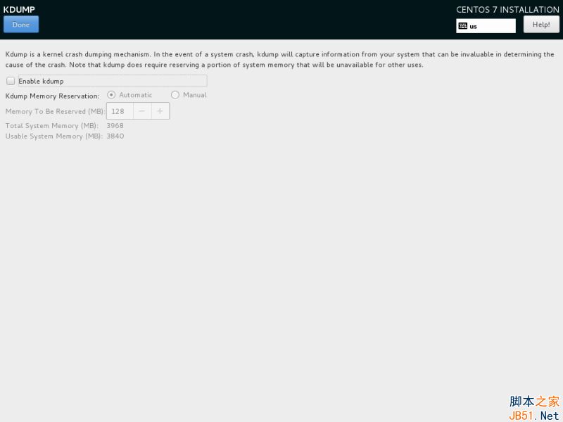 10、 接下來,如果你想要釋放系統(tǒng)內(nèi)存,點(diǎn)擊 KDUMP 選項(xiàng)并禁用它。點(diǎn)擊“完成Done”并回到主安裝界面。