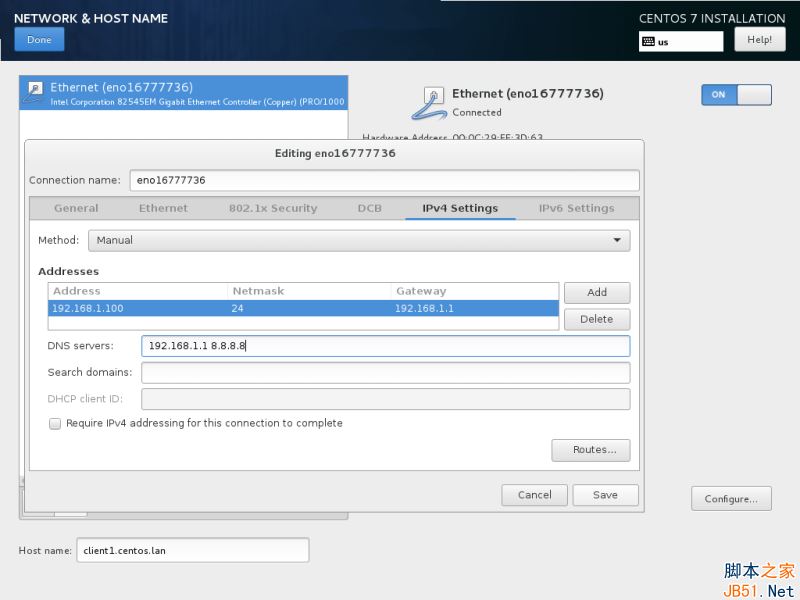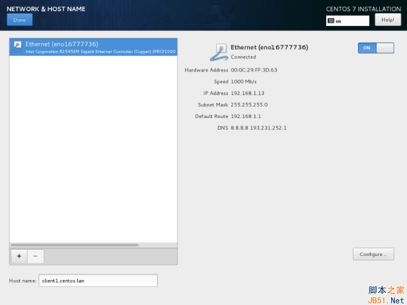 11、 在下一步中設(shè)置你的主機(jī)名并啟用網(wǎng)絡(luò)服務(wù)。點(diǎn)擊“網(wǎng)絡(luò)和主機(jī)名Network & Hostname”,在主機(jī)名中輸入你的 FQDN(完整限定網(wǎng)域名稱),如果你在局域網(wǎng)中有一個(gè) DHCP 服務(wù)器,將以太網(wǎng)按鈕從 OFF 切換到 ON 來激活網(wǎng)絡(luò)接口。