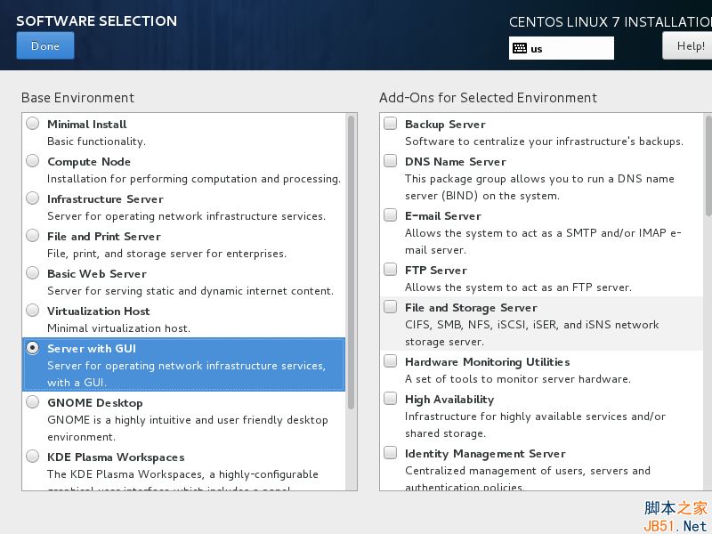 8、 假設(shè)你要在服務(wù)器上安裝一個(gè)圖形界面,選擇左邊那欄“帶 GUI 的服務(wù)器Server with GUI”那項(xiàng),并在右邊那欄中根據(jù)你需要提供給客戶端的服務(wù)選擇合適的附加軟件。