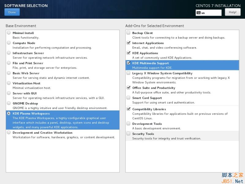 左邊的列表是你可以選擇安裝桌面環(huán)境(Gnome、KDE Plasma 或者創(chuàng)意工作站)或者安裝一個(gè)服務(wù)器環(huán)境(Web 服務(wù)器、計(jì)算節(jié)點(diǎn)、虛擬化主機(jī)、基礎(chǔ)設(shè)施服務(wù)器、帶圖形界面的服務(wù)器或者文件及打印服務(wù)器)或者執(zhí)行一個(gè)最小化的安裝。