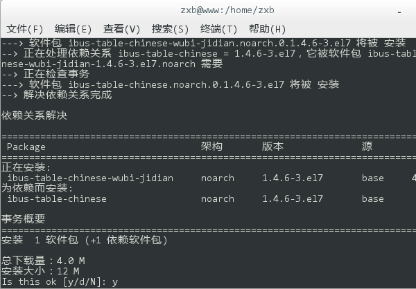 6、然后,輸入 yum install ibus ibus-table-wubi 安裝極點(diǎn)五筆輸入法,并且在執(zhí)行過(guò)程中鍵入 y 確認(rèn)下載和安裝。