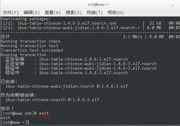 7、安裝成功后,鍵入 exit 退出 root 帳號(hào),然后再關(guān)閉終端窗口。當(dāng)然,你也可以不退出直接關(guān)閉終端(這會(huì)在關(guān)閉時(shí)彈出一個(gè)警告提示框,直接無(wú)視即可),這是沒(méi)有關(guān)系的。