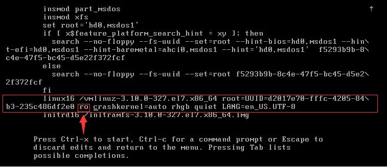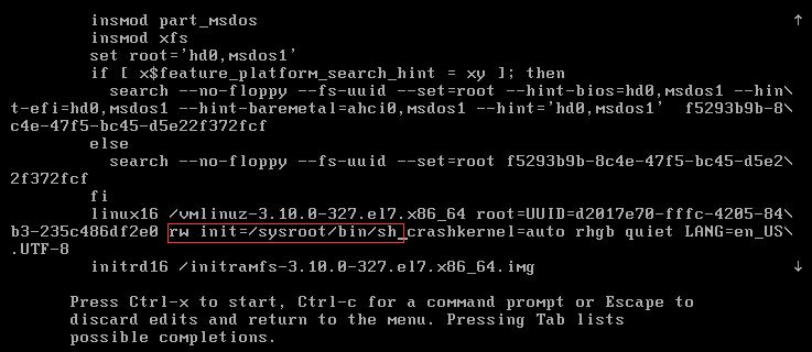 找到這個(gè)or,并將or替換為rw init=/sysroot/bin/sh,其余不變。