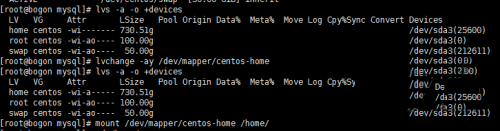 (1).lvs -a -o +devices查看磁盤詳細信息,可以看到home的attr參數沒有a(激活)未激活狀態