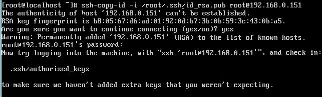 [root@localhost ~]# ssh-copy-id -i /root/.ssh/id_rsa.pub root@192.168.0.151