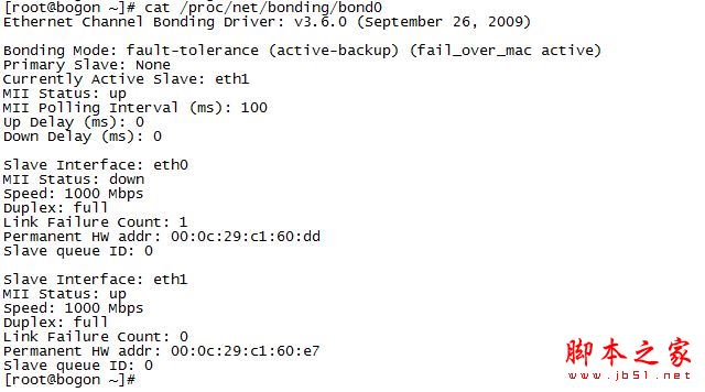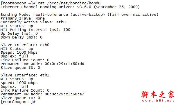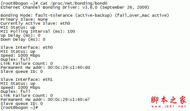 說明:如果是在虛擬機里BONDING_OPTS 需要添加fail_over_mac=1 如BONDING_OPTS=”miimon=100 mode=1 fail_over_mac=1”