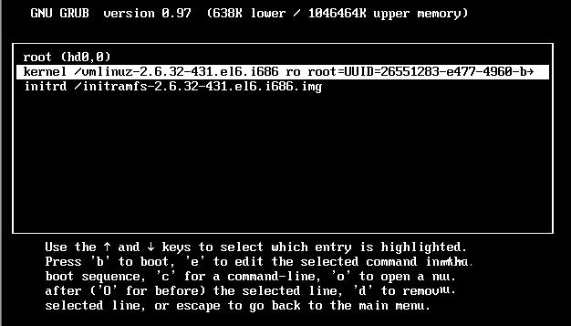 D.機房老鳥就說:”選那個最長的 按一下e 在末尾加個 1, b鍵重啟” 進入下圖以后:移動光標至 kernel 配置項這一行,也就是最長的那一行?。。?!再次按 e 編輯(如下圖)