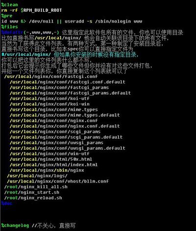 在SPECS目錄執行 rpmbuild –bb nginx.spec ,同時記下來安裝過程所提示需要安裝的包。這個命令會按照我們的spec 指定的方式編譯軟件并且會在/root/rpmbuild/RPMS/x86_64/ 目錄生成對應的rpm包,這個rpm包默認會記錄在這個軟件編譯過程中會依賴于哪些其他軟件,再次強調,如果你打包的時候和你安裝的時候環境不一樣,一定要注意在安裝rpm之前手動安裝好依賴,解決可能會出現的版本過低的問題。