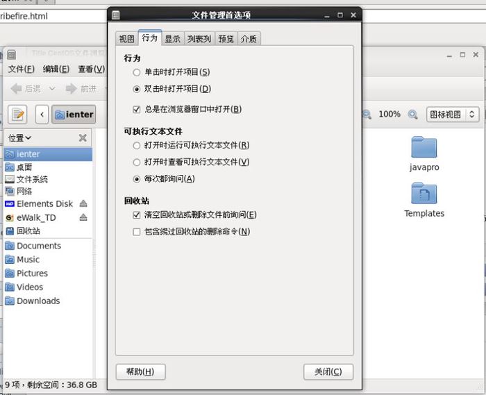 這個東西可見的太少了,但是在應用程序菜單下的系統(tǒng)工具中的文件瀏覽器打開就不是這種簡單模式了,想改,但是不知道,也沒特意的查找這些東西,只是今天突然設置了一下首選項,還真的出來了,就是在首選項的“行為”選項卡中的“總是在瀏覽器窗口中打開”,把它前面的復選框選中,再操作的時候,無論在哪個位置打開,都不再是那種簡單模式了。