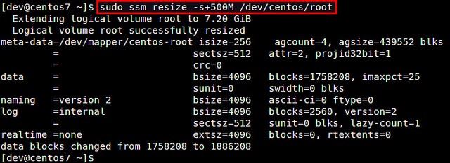我們可以核實,/dev/centos/root卷的大小已從6.7GB增加到了7.2GB。不過,這并不意味著你立即就可以使用在卷中創建的文件系統里面的額外空間。你會發現,文件系統大小(“FS size”)仍然是6.7GB。