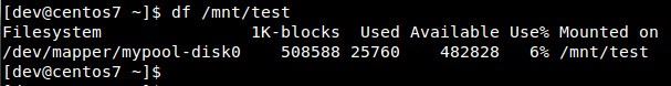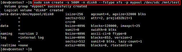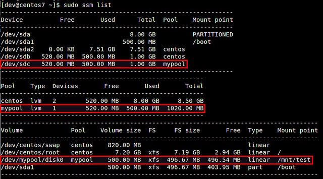 $ sudo ssm create -s 500M -n disk0 --fstype xfs -p mypool /dev/sdc /mnt/test