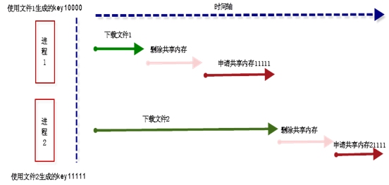 在有下載文件操作的程序中,對下載的文件使用ftok獲取key的時候,需要進行沖突避免的措施,如使用獨占的方式獲取共享內存,如果不成功,則對key進行加一操作,再進行獲取共享內存,一直到不會產生沖突為止。