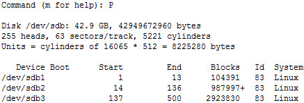 (1)利用fdisk /dev/adb對(duì)空的硬盤進(jìn)行分區(qū),分區(qū)大小分別為主分區(qū)一(作為引導(dǎo)分區(qū))100M、主分區(qū)二(作為根分區(qū))1G(根分區(qū)不能太小)和主分區(qū)三(作為虛擬分區(qū))500M