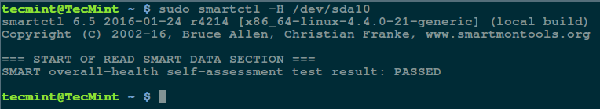 然后執(zhí)行 smartctrl 命令并在命令中指定你的設(shè)備作為參數(shù),以下命令包含了參數(shù) -H 或 --health 以顯示 SMART 整體健康自我評(píng)估測(cè)試結(jié)果。