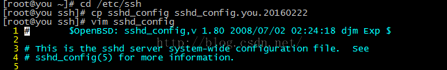 4.修改配置文件前先備份以主機名時間日期的格式進行命名,這里將/etc/ssh/sshd_config備份為/etc/ssh/sshd_config.you.20160222