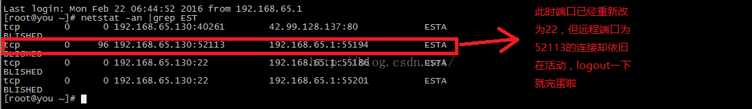 如果修改過端口后,以未修改前的端口登陸的連接依舊活動且連接但一旦登出就會連接不上的說: