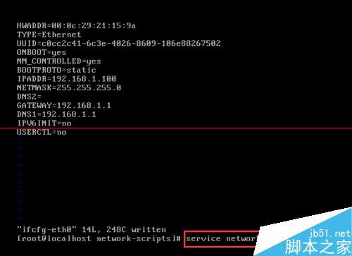 6、輸入“service network restart”點回車,使網(wǎng)絡(luò)服務(wù)重啟