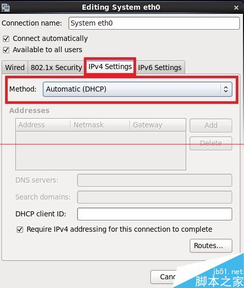 3、在打開的編輯頁面中選擇IPv4選項,可以看到method里面默認是DHCP自動獲取IP模式;