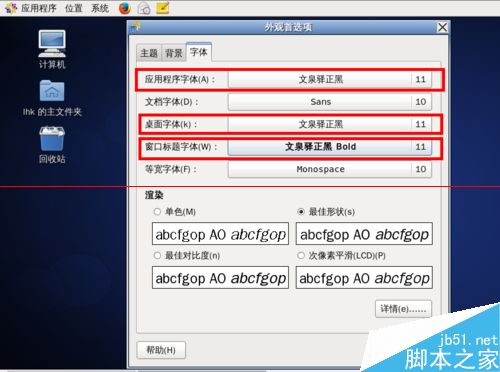 4、分別設置【應用程序字體】、【桌面字體】、【窗口標題字體】,我選擇的是中文顯示非常美觀的“文泉驛正黑”,字號為“11”,其中【窗口標題文字】選擇的粗體,如下圖所示: