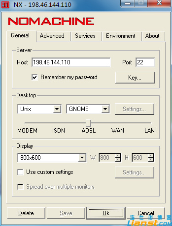 2、在freenx里創建一個連接,輸入你的linux vps的IP,端口,desktop選擇 gnome如下圖: