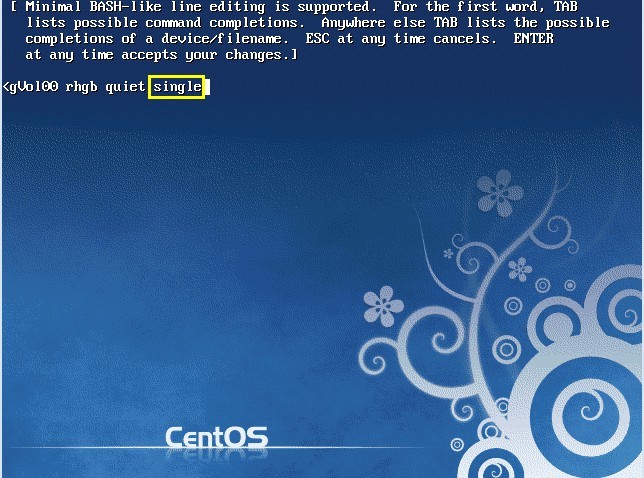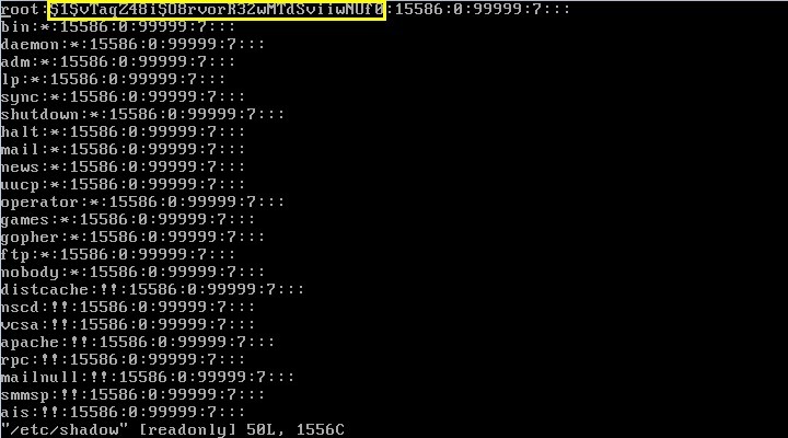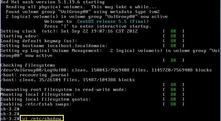 輸入完成后,回車。此時返回到之前的頁面,光標會定位在第二行kernel,再按B(啟動),稍等一會會啟動到如下界面, 輸入 vi /etc/shadow (編輯shadow)