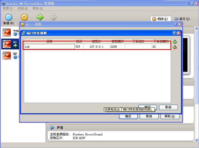 打開virtualbox 的設置窗口 -> 網絡 ->網卡1 啟用網絡連接-> 連接方式:NAT ->接入網線->端口轉發 , 設置如下