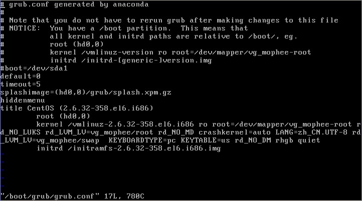 vi /boot/grub/grub.conf #打開 grub.conf