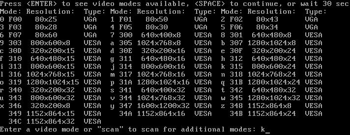 如上圖,重啟后會首先顯示第一行,按ENTER鍵后顯示系統(tǒng)支持的分辨率。這里輸入 k ,即分辨率將調(diào)整為800×600×24,還有,請記住k后面的數(shù)字:315(如果不想每次都這么選擇的話,進入系統(tǒng)后再將vga=ask,改成vga=315)