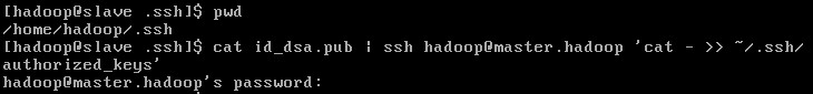 如上圖,執行命令 cat ~/.ssh/id_dsa.pub | ssh hadoop@master.hadoop 'cat - >> ~/.ssh/authorized_keys',并輸入master.hadoop主機的hadoop用戶的登錄密碼,即可將公鑰發送到master.hadoop并追加到其authorized_keys文件中。
