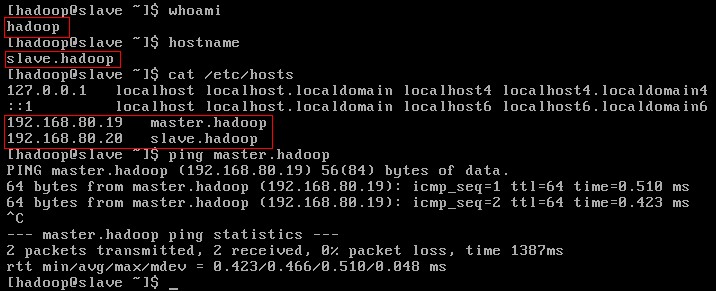 如上圖,當前登錄用戶為hadoop,主機名為slave.hadoop,與master.hadoop主機的網絡是通暢的。