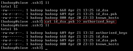 如上圖,slave.hadoop已經能夠使用ssh無密碼登錄本機了。那么如何讓它無密碼登錄到Master.hadoop主機中呢?當然是分發公鑰文件id_dsa.pub的內容到master.hadoop主機上了。如下圖: