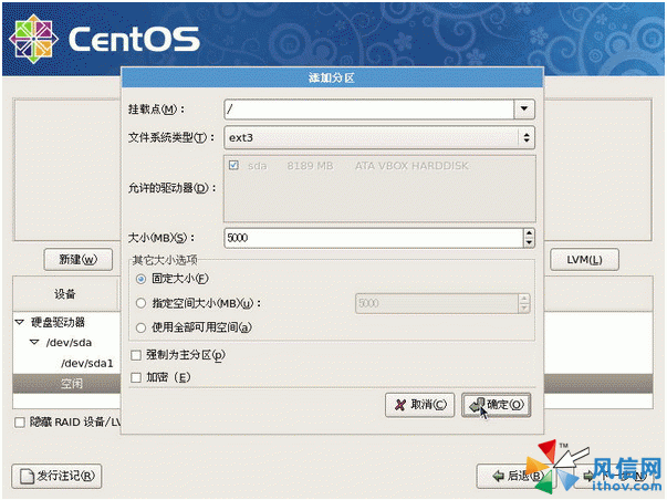 接下來建立根目錄(/)的分區。按下“新建”后,就會出現如下的畫面。由于我們需要的根目錄是使用Linux的文件系統,因此預設就是ext3這個文件系統。 至于在掛載點的地方,你可以手動輸入也可以用鼠標來挑選。 最后在大小(MB)的地方輸入你所需要的磁盤容量即可。不過由于作者這個系統當中只有一顆硬盤,所以在“允許的驅動器”里面就不能夠自由挑選。