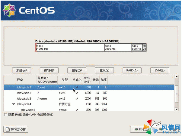 最終建立/boot分區的結果如下所示,他會主動的將/boot這個特殊目錄移到硬盤最前面,所以你會看到/boot所在的硬盤分區為/dev/hda1,而起始磁柱則為1號。情況如下圖所示: