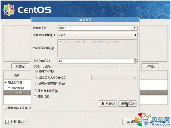 我們繼續按下“新建”來建立/boot這個分區。依序填入正確的信息,包括掛載點、文件系統類型、大小等。務必讓該分區在整個硬盤的最前面部分。因此,我們針對/boot就選擇“強制為主分區”。如下圖所示: