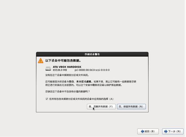 7、會提示“以下設備中可能包含數據”,由于是使用虛擬機新建的虛擬硬盤,里面沒有任何數據,選擇忽略