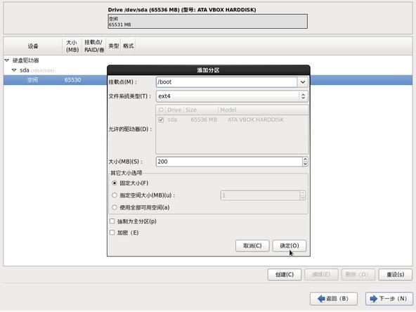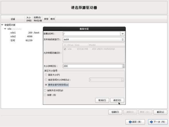 16、再創建一個分區,掛載點選擇“/”,使用全部可用空間
