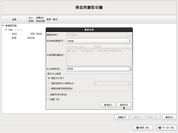 15、再創建一個分區,文件系統類型選擇swap,大小選擇4096
