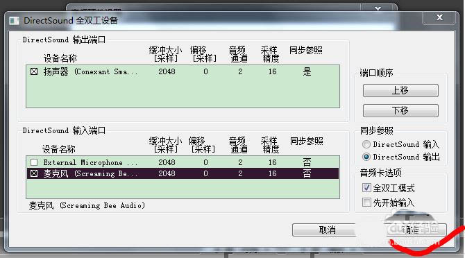 5、在“DirectSound輸入端口”的“設備名稱”中任意選擇一個,然后確定
