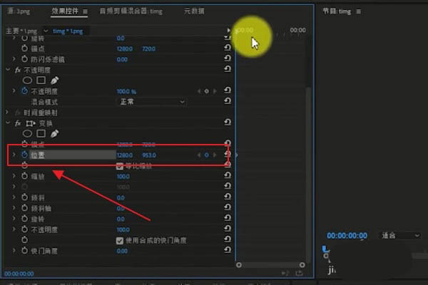 4、我們在【效果控件】中找到【位置】,添加關(guān)鍵幀,然后將位置坐標(biāo)調(diào)低一點點。