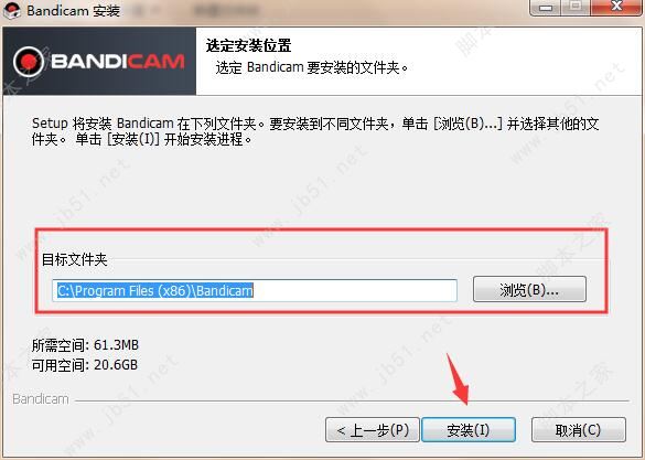 6.選擇安裝目錄,不建議安裝在C盤,可以選擇安裝在其他目錄,如D盤等(默認(rèn)安裝目錄:C:/Program Files (x86)/Bandicam),如圖