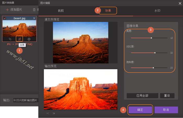 應用效果: 單擊圖片上的效果按鈕,一個新窗口將會彈出,讓您調整圖片亮度,對比度和飽和度。點擊確定按鈕以保存更改。